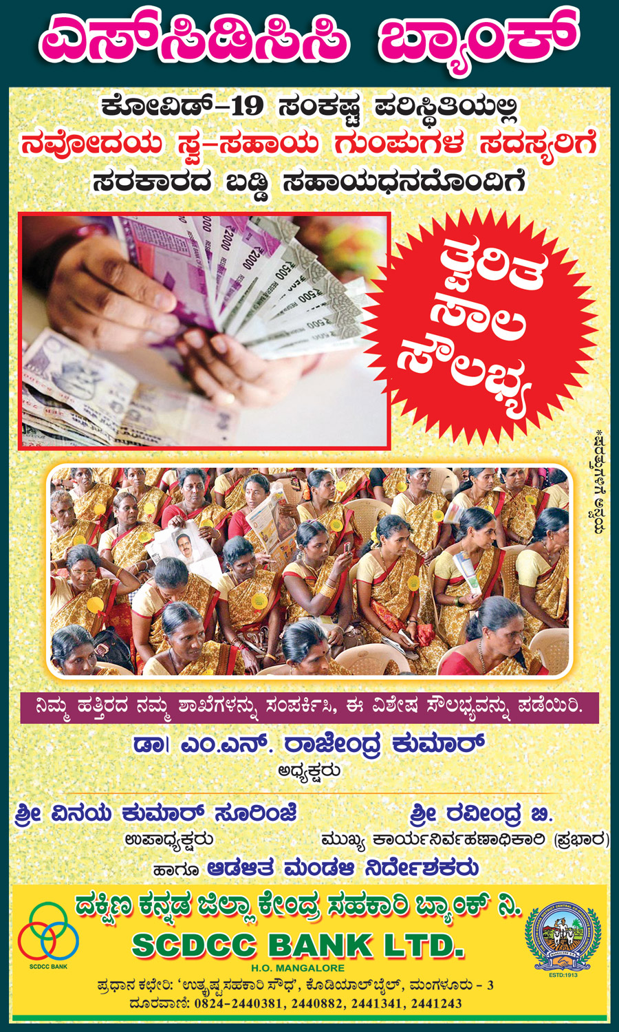ಮಂಗಳೂರು* ಒಂದು ಶತಮಾನದಷ್ಟು ಸುದೀರ್ಘ ಇತಿಹಾಸವನ್ನು ತನ್ನಲ್ಲಿಟ್ಟುಕೊಂಡಿರುವ ದಕ್ಷಿಣ ಕನ್ನಡ ಜಿಲ್ಲಾ ಕೇಂದ್ರ ಸಹಕಾರಿ ಬ್ಯಾಂಕ್ (ಎಸ್ಸಿಡಿಸಿಸಿ ಬ್ಯಾಂಕ್) ಆಧುನಿಕ ಬ್ಯಾಂಕಿಂಗ್ ಸೇವೆಯಲ್ಲಿ ರಾಷ್ಟ್ರಕ್ಕೆ ಮಾದರಿಯಾಗಿದೆ. ಸಮಸ್ತ ರೈತಾಪಿ ವರ್ಗದ ಹಾಗೂ ಗ್ರಾಹಕರ ಸೇವೆಯಲ್ಲಿ ಜನ ಮನ್ನಣೆ ಗಳಿಸಿ ‘ಜನಸ್ನೇಹಿ’ ಬ್ಯಾಂಕ್ ಎನ್ನುವ ಪ್ರೀತಿ ವಿಶ್ವಾಸಕ್ಕೆ ಎಸ್ಸಿಡಿಸಿಸಿ ಬ್ಯಾಂಕ್ ಪಾತ್ರವಾಗಿದೆ. ಬ್ಯಾಂಕ್ ಸಹಕಾರಿ ರಂಗದಲ್ಲಿ ವಿಶಿಷ್ಠ ವಿನೂತನ ಸಾಧನೆಯೊಂದಿಗೆ ದೇಶದ ಮೊದಲ ಜಿಲ್ಲಾ ಕೇಂದ್ರ ಸಹಕಾರಿ ಬ್ಯಾಂಕ್ ಆಗಿ ಜನಾನುರಾಗಿಯಾಗಿದೆ. 2018-19ನೇ ಸಾಲಿನಲ್ಲಿ ಬ್ಯಾಂಕ್ ಸಾರ್ವಕಾಲಿಕ ಗರಿಷ್ಠ ರೂ.30.29 ಕೋಟಿ ಲಾಭ ಗಳಿಸಿ ತನ್ನ ಸದಸ್ಯ ಸಂಘಗಳಿಗೆ ಶೇ.9.00 ಡಿವಿಡೆಂಡ್ನ್ನು ಬ್ಯಾಂಕಿನ ಅಧ್ಯಕ್ಷರಾದ ಡಾ|| ಎಂ.ಎನ್. ರಾಜೇಂದ್ರ ಕುಮಾರ್ರವರು ಬ್ಯಾಂಕಿನ ವಾರ್ಷಿಕ ಮಹಾಸಭೆಯಲ್ಲಿ ಘೋಷಣೆ ಮಾಡಿದ್ದಾರೆ.